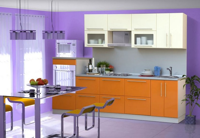 - сиреневый в сочетании с оранжевым создаёт эффектную и необычную комбинацию, которую оценят креативные люди. Такие тона могут комбинироваться в текстиле, гарнитуре, отделке стен, фартуке.