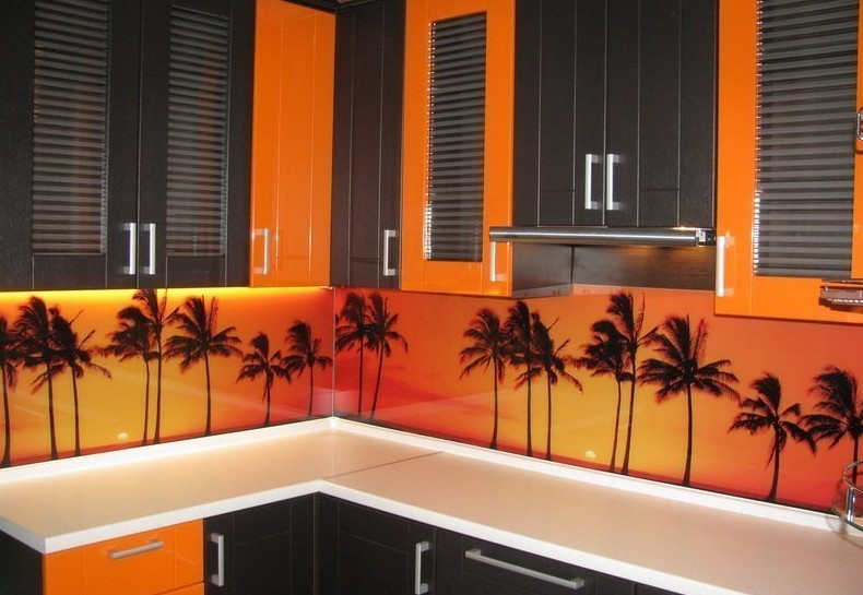 - фартук оранжевого цвета — хорошее решение для создания акцента в интерьере кухни. Керамическая плитка, пластиковые или стеклянные панели, обои и стекло, окрашивание — для оформления уместны практичные материалы. Для современных стилей подходят фартуки с фоторисунком, а если интерьер имеет черты классического стиля, то уместны бело-оранжевые или другие узоры. Обеденный стол или рабочую зону можно оснастить яркой столешницей. При этом фасады шкафов должны быть нейтрального тона: белого, серого, чёрного, бежевого. Можно использовать одновременно столешницу рабочей зоны и фартук одного тона;