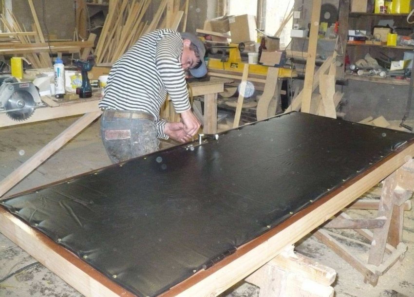 - Финишная отделка. Если используется ламинированный ДВП, то можно так и оставить. В противном случае на ДВП фиксируют слой поролона, после чего укрывают его кожей или дерматином.