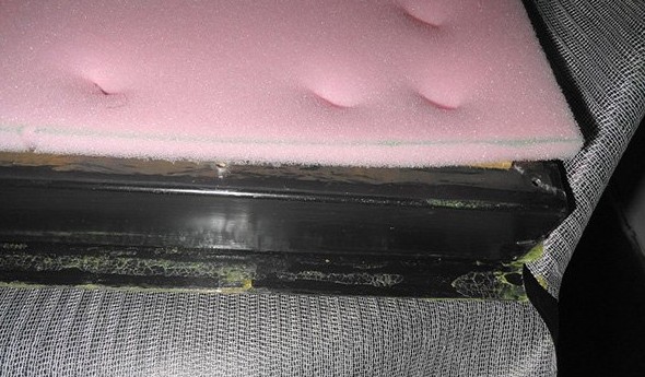 - Демонтаж финишного покрытия. Если это натуральная кожа и её планируется снова использовать, то снимать материал надо аккуратно. Дерматиновую обивку обычно меняют вместе с утеплителем.