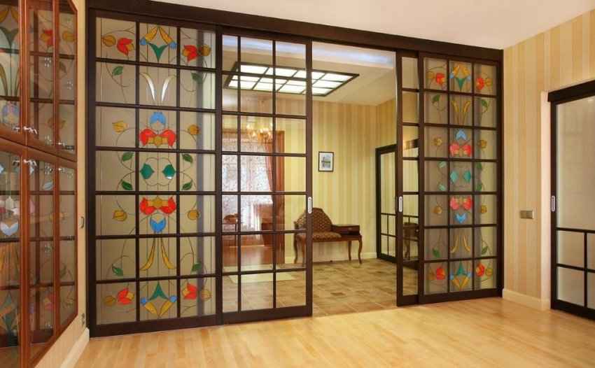 - оригинальные стеклянные двери с витражным рисунком уместны для интерьера модерн и классических направлений.