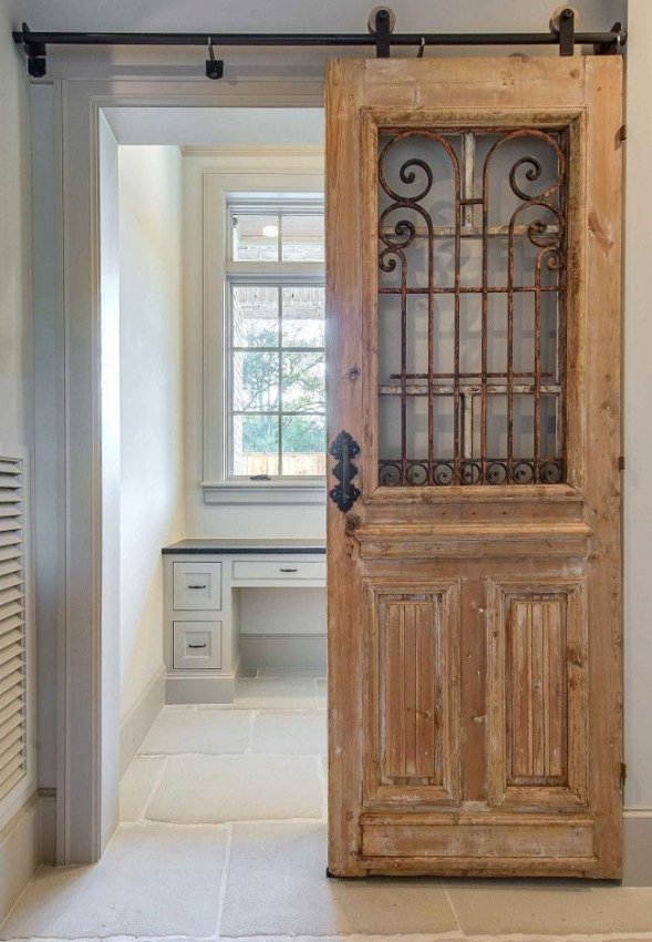 - светлые состаренные двери выглядят более приятно, чем тёмные, которые обладают грубоватым видом. Светлые двери уместны в интерьере шебби-шик, прованс, а тёмные можно использовать в кантри.
