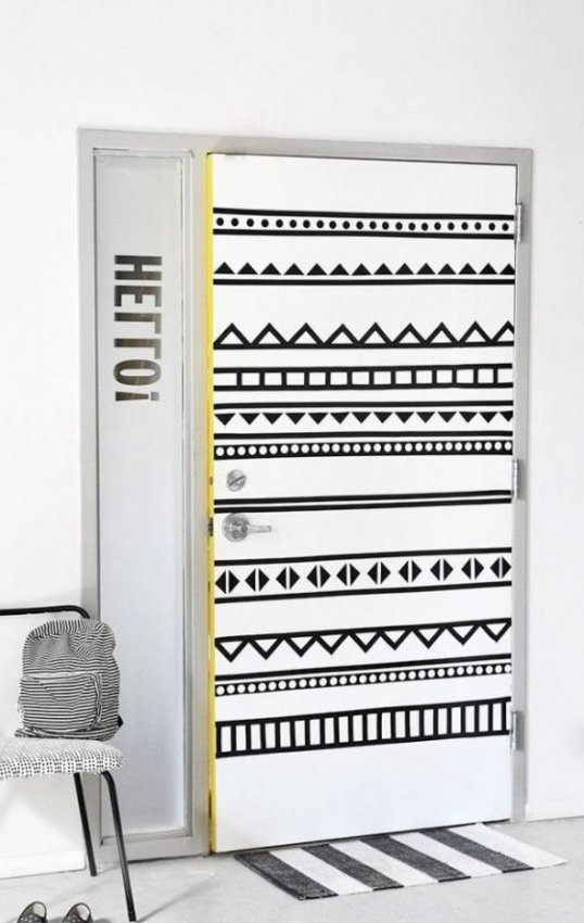 - двери с ярким узором в виде геометрических фигур или витых элементов подходят для стен с лаконичной и однотонной отделкой;