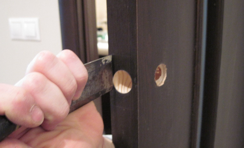 - Создание посадочного места для корпуса замка. Делают это молотком и стамеской. На торце двери при помощи выбранных инструментов создают отверстие, соответствующее размерам замка.