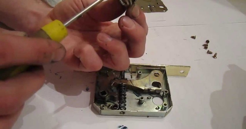 - Засорение механизма или поломка возвратной пружины. Если неисправность произошла в корпусе замка, то его надо изъять из дверной коробки. Для этого откручивают крепления и вынимают корпус. После этого разбирают замок, удаляют из него попавшие туда мусор и пыль. Если из строя вышла пружина, то её меняют. Проверяют работоспособность замка. Сборка выполняется в обратной последовательности.