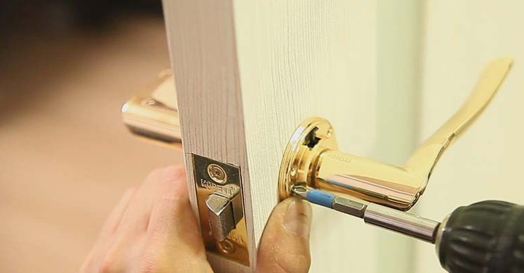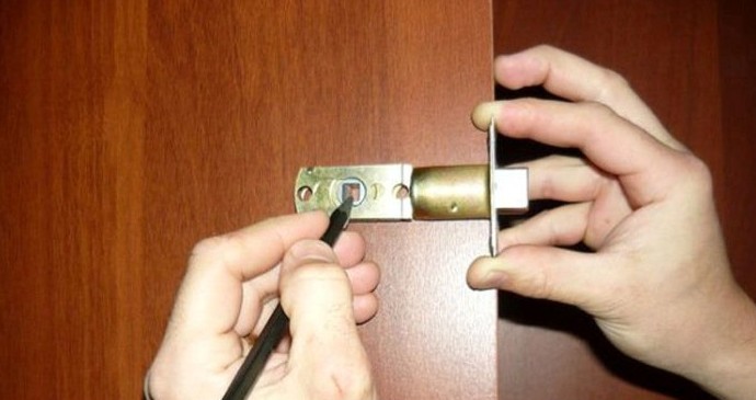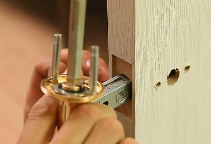 - Монтаж замка. В созданное в дверном полотне отверстие вставляют замок и проверяют его работу. Механизм должен работать плавно и легко.