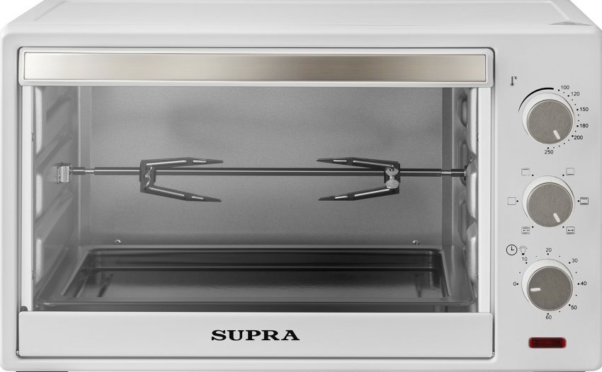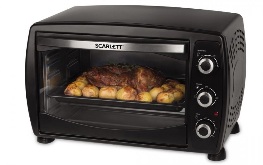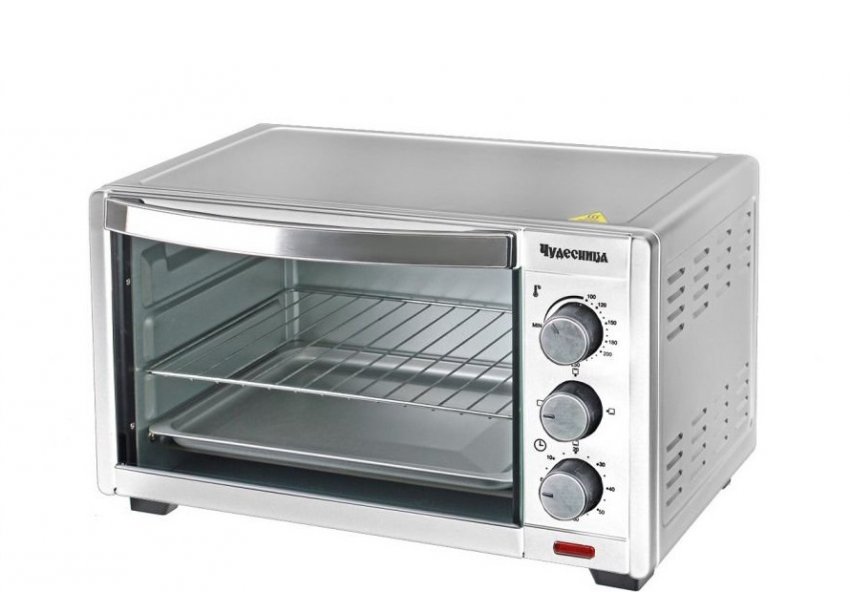 Электропечь объёмом 37 литров и мощностью 1,4 кВт быстро нагревается, плавно переключает температуру в камере, работает в трёх режимах. Встроенный таймер на 1,5 часа не только оповестит звуковым сигналом, но и отключит прибор. Вместительный гриль позволит приготовить курицу около 1–1,5 кг. Укомплектовано устройство большой решёткой под мясо и двумя противнями с эмалированным легко моющимся покрытием (прямоугольным и круглым). Подсветки нет, к тому же из-за отсутствия достаточной термоизоляции корпуса внешние стенки прибора ощутимо нагреваются.