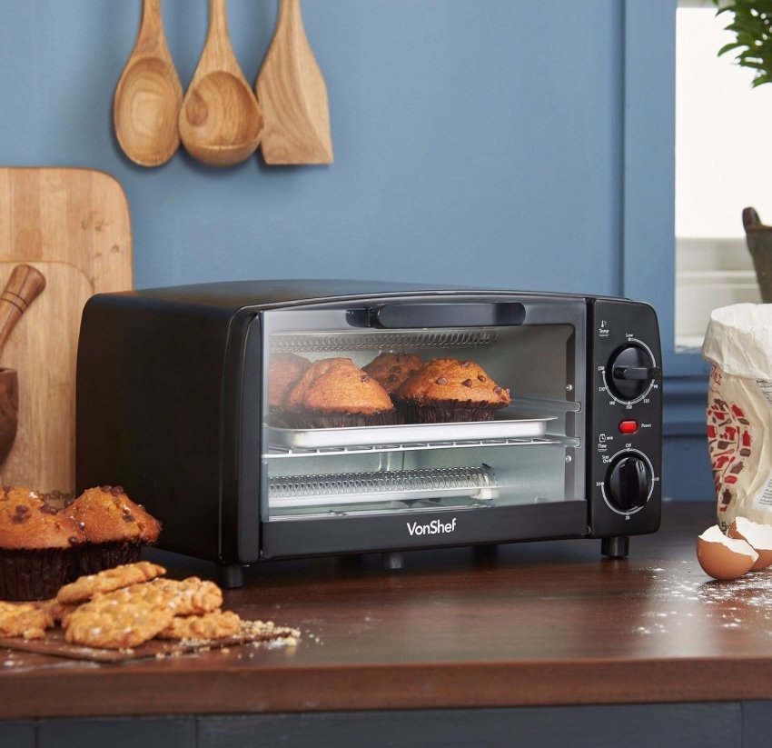 Чрезвычайно компактная мини-печь с внутренним объёмом всего 9 литров и мощностью 1,31 кВт. Прибор оборудован подсветкой и автоотключением, а также таймером обратного отсчёта на 15 минут. Управление очень простое при помощи поворотных переключателей, в стандартную комплектацию входит низкий противень и решётка из нержавейки. Четыре температуры нагрева, но точного значения устройство не показывает (тост, высокая, средняя и низкая). Слишком малый объём ограничивает применение разогревом и простыми блюдами, например, курица, утка или пицца в эту печь не войдут.