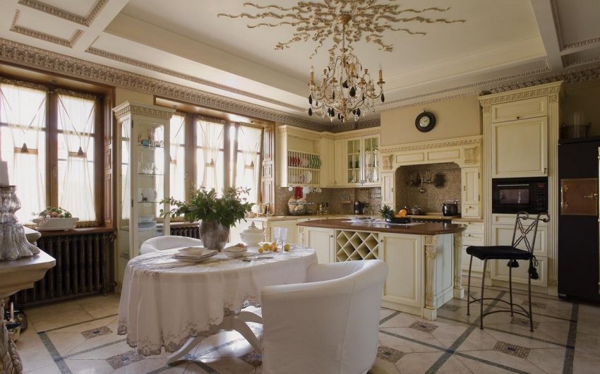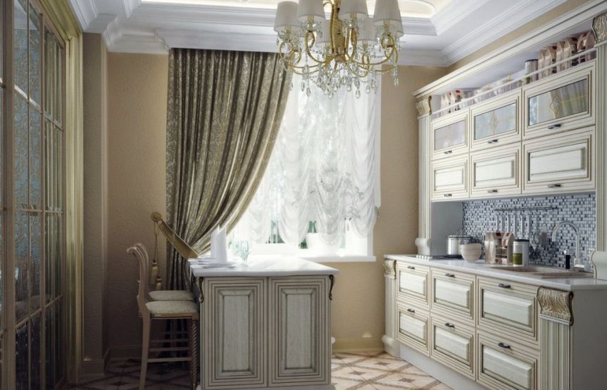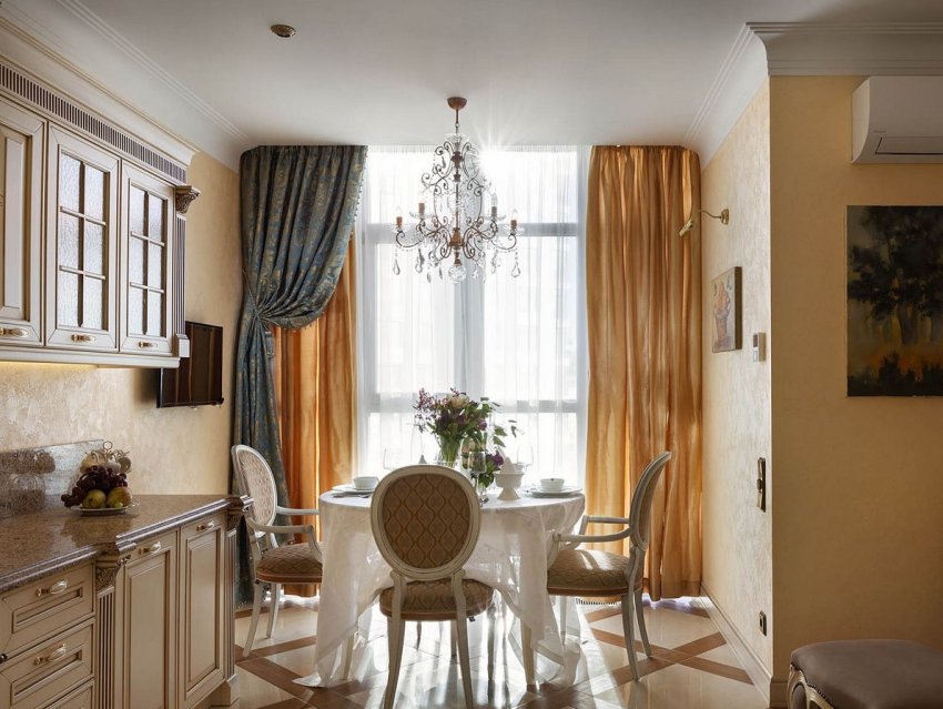 - текстиль в интерьере классической кухни часто представлен плотными портьерами из тафты или атласа, но можно использовать и хлопковые скатерти на стол, украшенные витыми узорами, вуаль с кружевом для окна;