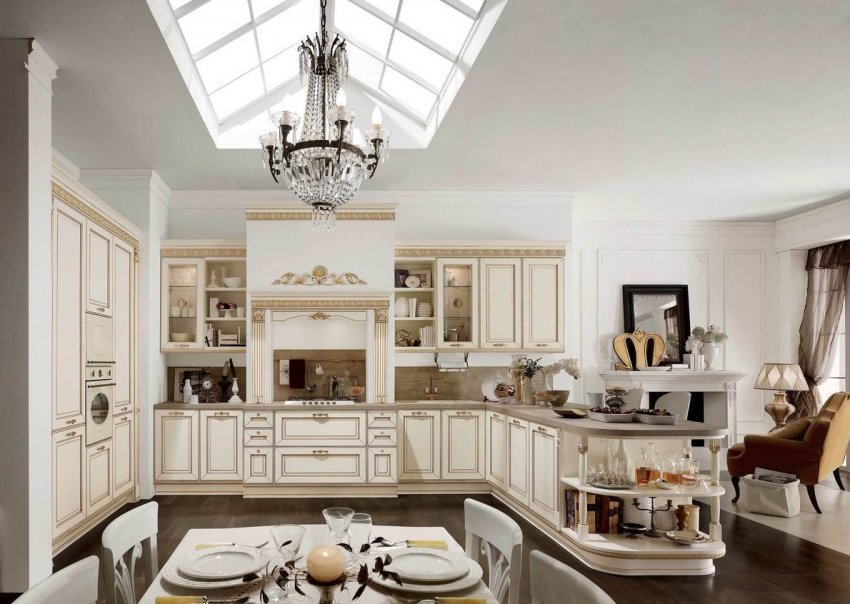- главным осветительным прибором на кухне является массивная многорожковая люстра. Кованый вариант лучше всего впишется в итальянский дизайн, но хорошо смотрятся и хрустальные приборы. Дополнительно подсветить рабочую зону и периметр можно точечными светильниками. Внешний корпус таких элементов должен соответствовать дизайну люстры, например, кольцо встроенных светильников часто украшают стразами.