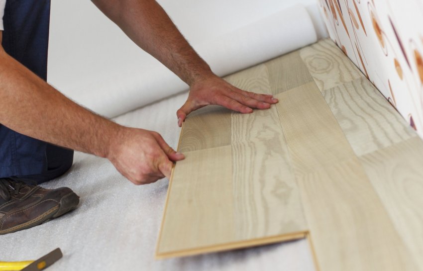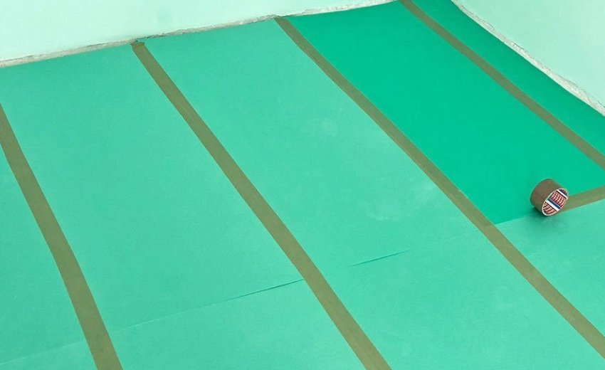 - Расстилают подложку из синтетических водонепроницаемых материалов (например, вспененный полиэтилен). Пробковые покрытия использовать не рекомендуется, потому как они склонны к усиленному впитыванию влаги.Подложка скрывает мелкие неровности, обеспечивает дополнительную гидроизоляцию, выполняет амортизирующую функцию и поглощает шум. Куски укладывают внахлёст с перекрытием 5–10 см по всей поверхности пола, стыки фиксируют малярным скотчем.