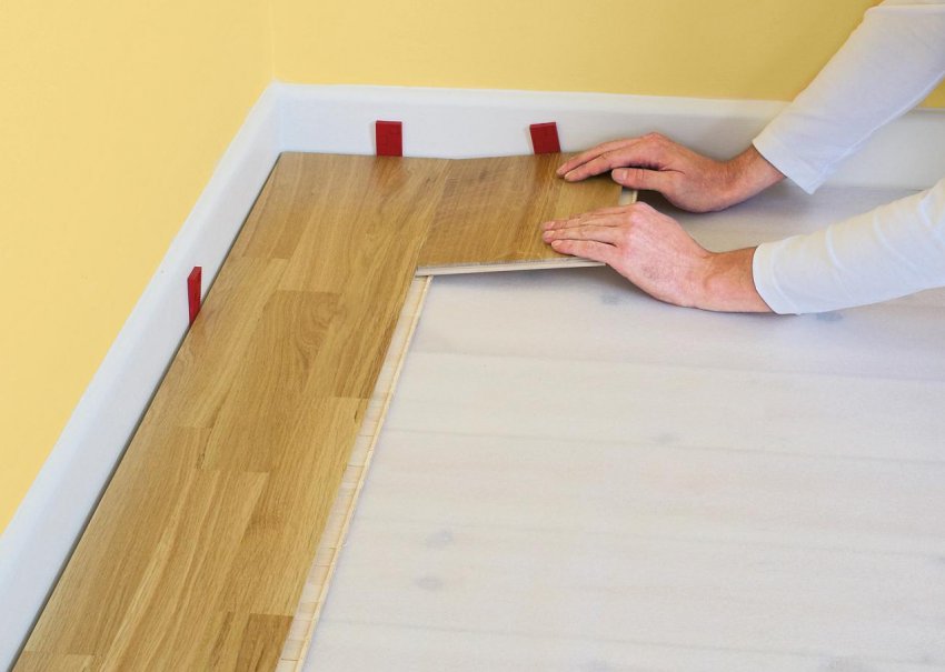 - Укладку ламелей начинают с дальнего угла комнаты вдоль стены, чтобы свет падал вдоль швов. От стен отступают на 8–10 мм, оставляя зазор для температурного расширения материала. Можно установить специальные распорки или клинья.