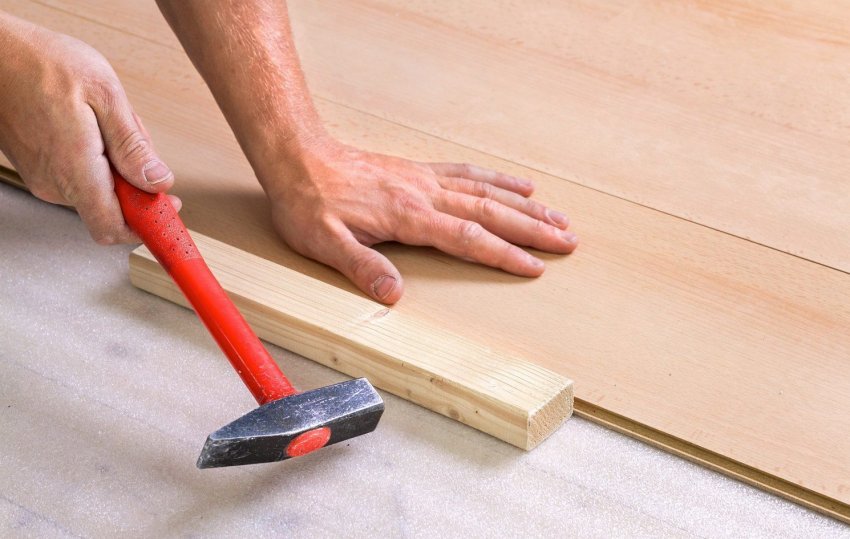 - Подобным образом выкладывают ламинатом всю поверхность пола, подгоняя элементы при помощи резинового молотка (киянки) и деревянного бруска.