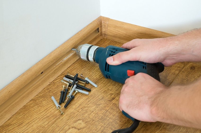 - По завершении работ вдоль стен монтируют плинтус, подобранный в цвет напольного покрытия, для закрытия температурных зазоров.