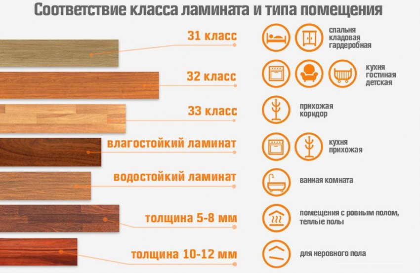 - Износостойкость и прочность. Для кухонных помещений надлежит выбирать материал не ниже 32–33 класса. Более высокий класс приобретать обычно нет никакой необходимости, потому как такой ламинат (коммерческий) предназначен для использования в помещениях с повышенной проходимостью.
