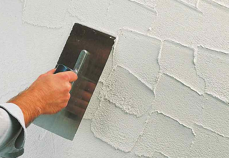 Первый слой штукатурки делают из материала, содержащего мелкую мраморную крошку. Он обеспечит надёжное сцепление с основанием. Наносят этот тонкий слой как обычную шпаклёвку, при помощи шпателя или стальной тёрки.