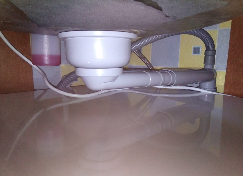 - Переделываем сифон под мойкой, который обычно мешает поставить маленькую посудомойку. В любом сантехническом магазине в продаже есть специальные низкие сифоны с отводом для подсоединения дополнительного слива. Меняем сифон, подключаем к нему сливной шланг. В крайнем случае шланг для слива можно просто опустить в чашу мойки и вода будет сливаться туда. Допускать перегибов сливного шланга нельзя, иначе грязная вода будет застаиваться в моечной камере.