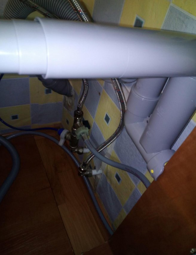 Наливной шланг подключаем к водопроводной трубе, ведущей к смесителю, через тройник