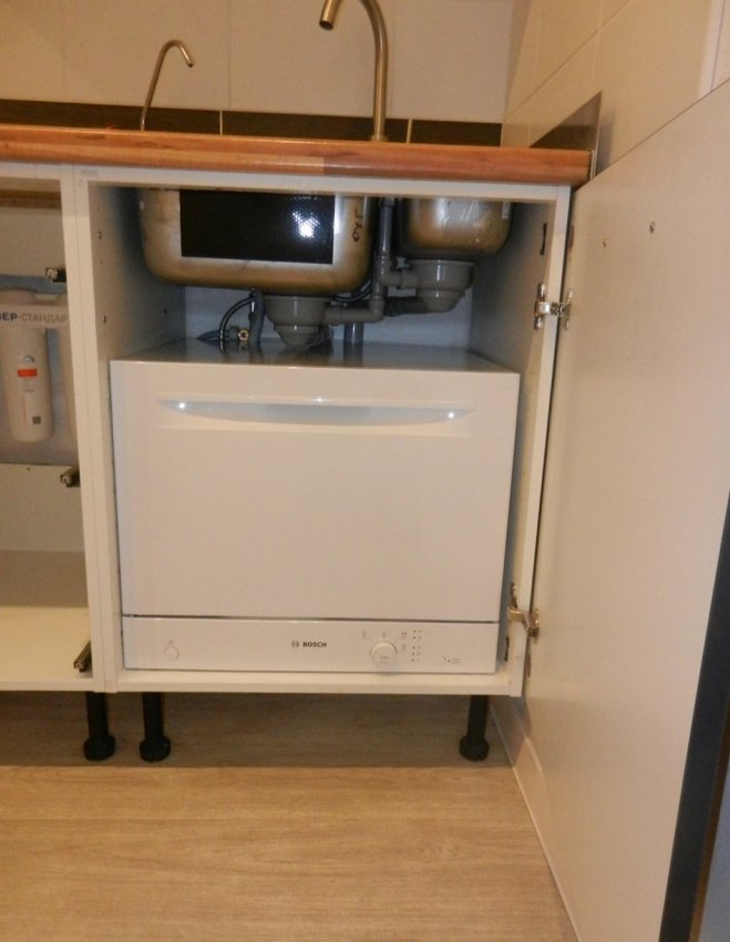 Полка тумбы, на которой будет размещаться мини-посудомойка, должна выдержать вес машины с посудой и залитой в неё водой. Для этого все мебельные элементы нужно прочно закрепить и при необходимости усилить.