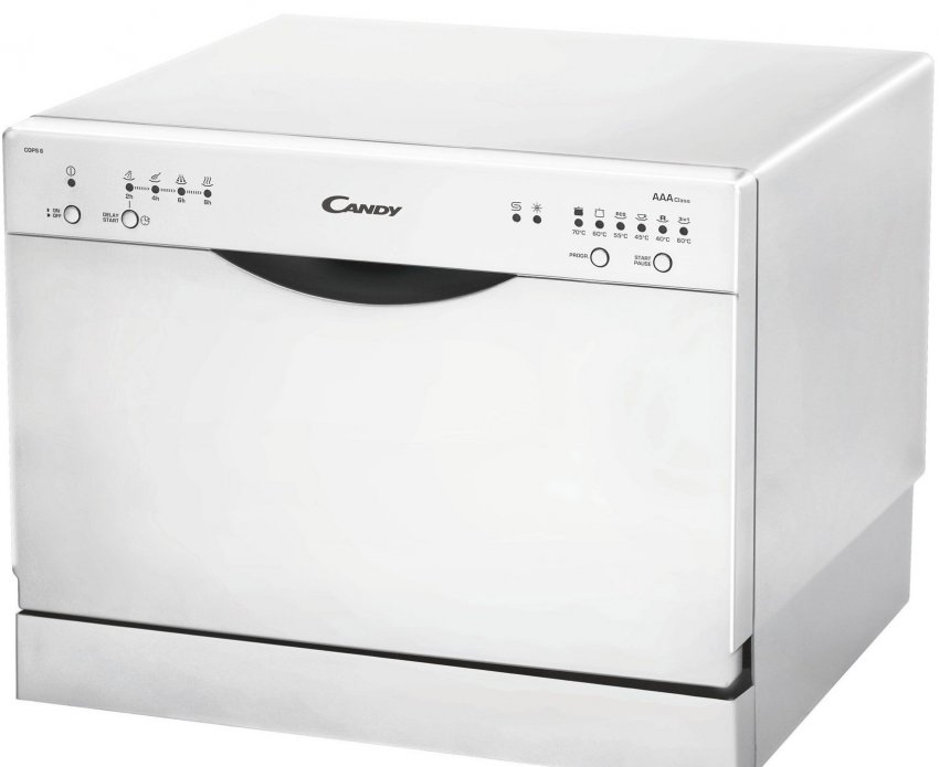 Почти самая маленькая, экономичная (класс А+) и бюджетная (в среднем около 13000 р.) мини-посудомойка, способная легко справиться с 6 наборами столовой посуды, затратив на это около 7 литров воды. Помимо отработки стандартного набора программ, аппарат может осуществлять деликатную мойку хрупких стеклянных или хрустальных изделий, а также экономично помыть слабо загрязнённую посуду, пользуясь 5 температурными режимами. Прибор с электромеханическим управлением даёт возможность отложить старт от 1 до 8 часов, оснащён индикаторами, показывающими наличие в своих отсеках моющих средств. Может использовать таблетки «3 в 1», сушит методом конденсации. Большим достоинством модели является оснащение полной защитой от любых случайных протечек и подаваемый звуковой сигнал по завершении программы. Недостатком можно считать довольно шумную работу (53 дБ), отсутствие датчика контроля жёсткости воды и блокировки, способной воспрепятствовать вмешательству в процесс работы подрастающего поколения.