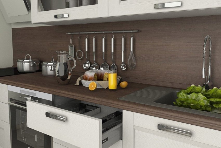 Часто ламинированную панель комбинируют со столешницей из того же материала.