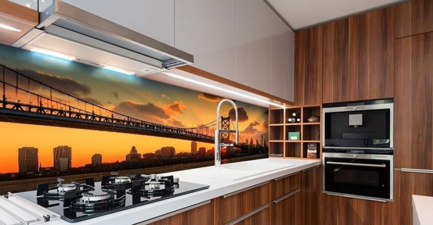 Если устанавливается панель с рисунком, размер узора должен соответствовать габаритам помещения. Фартук с крупным орнаментом на маленькой кухне будет смотреться громоздко и привлекать лишнее внимание.