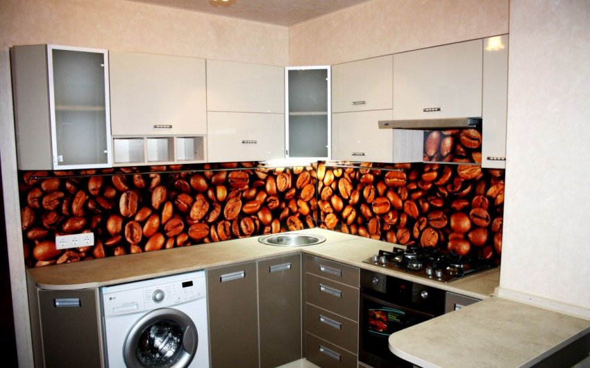 Фартук с крупным рисунком лучше подходит для просторных кухонь