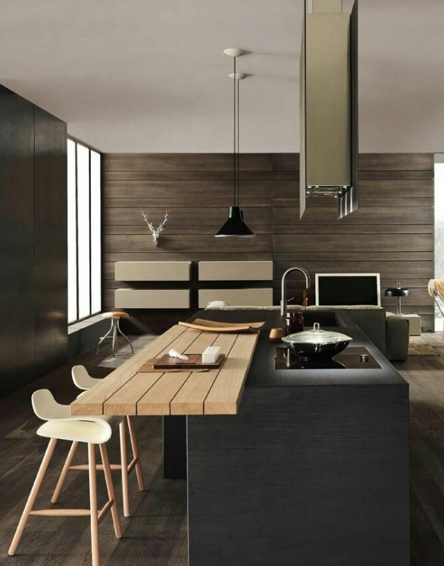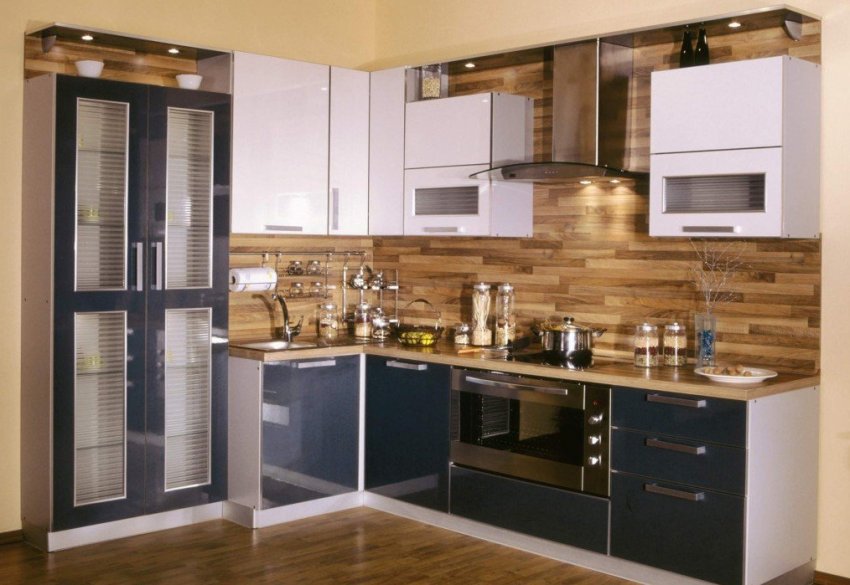 - Ламинат холодных оттенков эффектно будет смотреться в готических интерьерах (лучше ввыбрать панели в тёмных тонах), а также в стиле хай-тек. В некоторых случаях подобный фартук будет уместен и в прованской кухне.