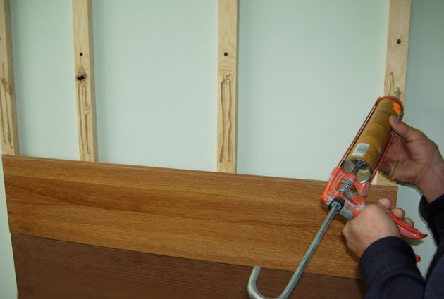 - Наносят клей на обратную сторону панели. Рекомендуется использовать силикон, а не «жидкие гвозди». Хотя эти вещества обладают похожими клеящими свойствами, силикон более текучий, что позволяет прижать материал максимально близко к стене, без образования бугорков и неровностей.