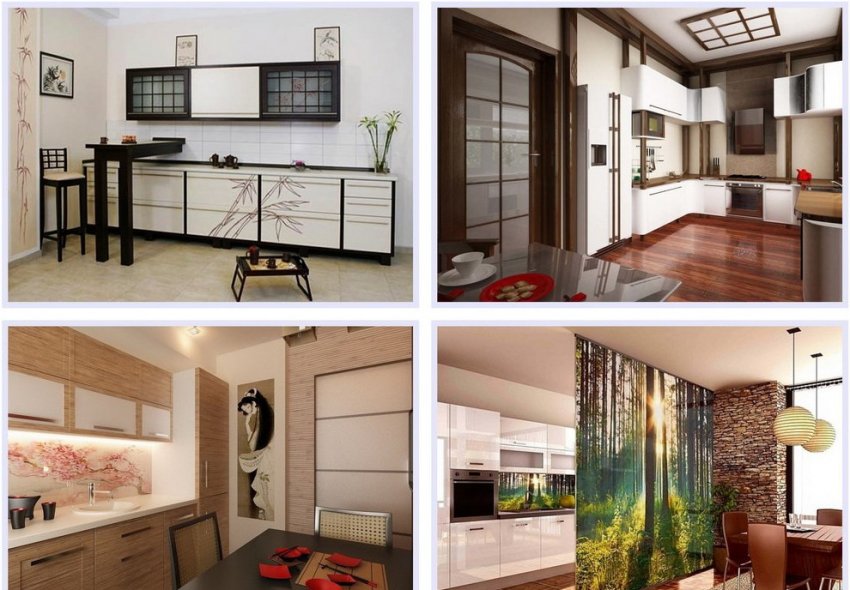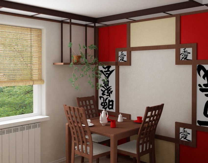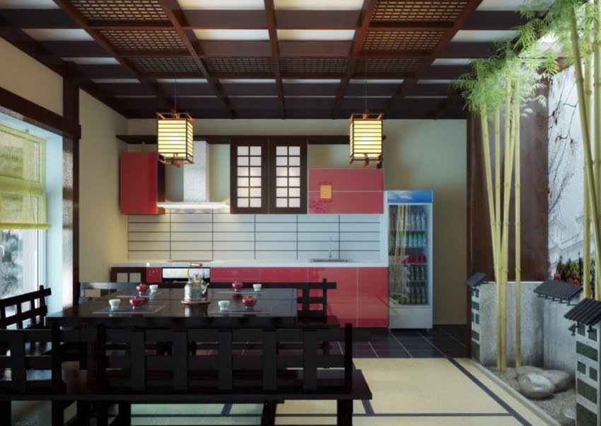 - Декорируют кухонное пространство вазами с веточками сакуры, фигурками нэцкэ, деревьями бонсай, татами, икебанами, иероглифами и т. д. Окна украшают бамбуковыми жалюзи или рулонными полотнами.