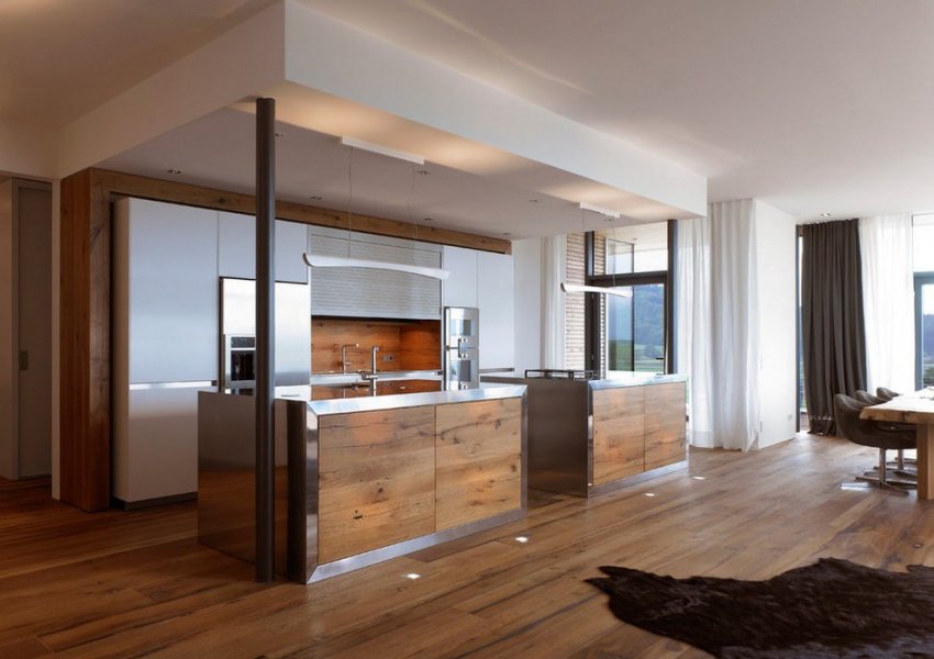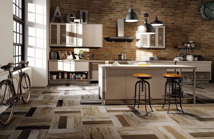 - Пол также является инструментом зонирования. Обычно в рабочей зоне настилают плитку, а в обеденной используют паркетную доску, ламинат под дерево или линолеум с эффектом бетонного пола.