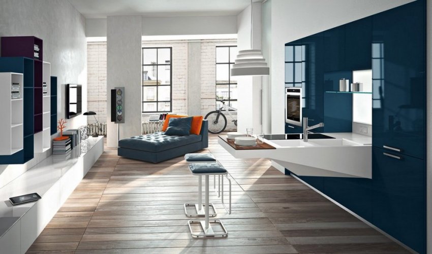 Кухня в стиле хай-тек с глянцевой синей мебелью удачно сочетается с блестящими тонами отделки и металлическими деталями техники