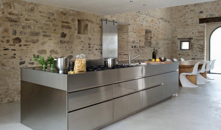 - Кухонные гарнитуры из полимера и металла, простые по дизайну, дополняются стеклянными вставками, столами на металлических ножках, стеллажами, пластмассовыми стульями и ультрастильными столешницами с минималистической плитой и раковиной.