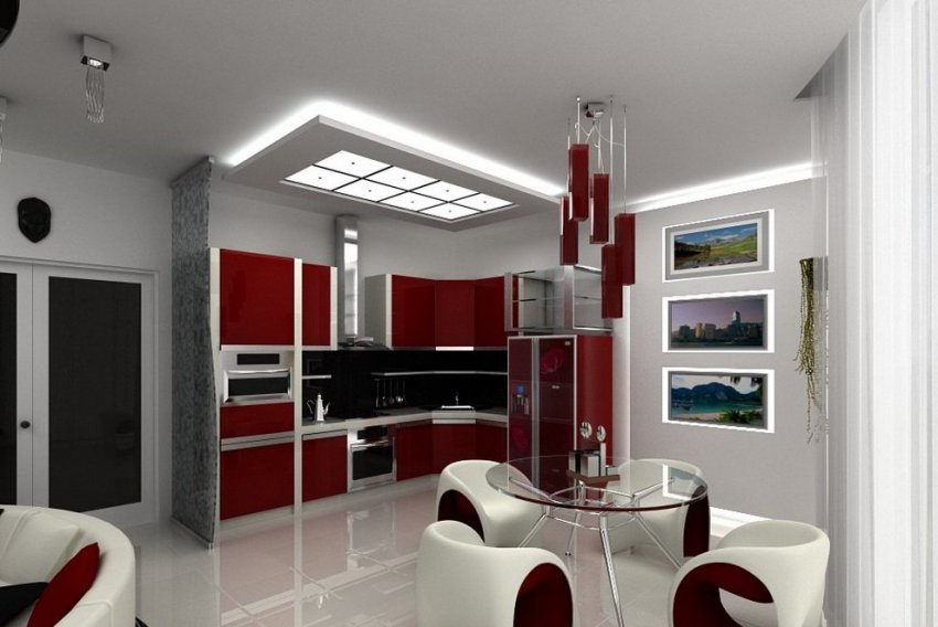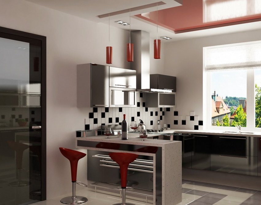 При использовании глянцевого натяжного потолка не стоит утяжелять интерьер кухни ещё и хромированными, металлическими и стеклянными элементами, чтобы не получить слишком блестящий интерьер
