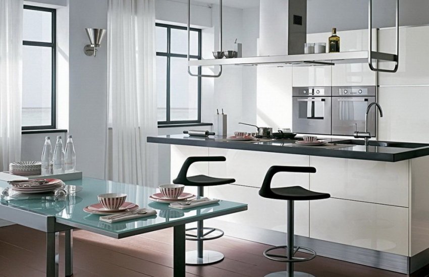 Главный фаворит на кухне хай-тек — модульный кухонный гарнитур со множеством функциональных шкафов, ящиков и каркасов для встраиваемой бытовой техники, дополненный столами и креслами замысловатых форм