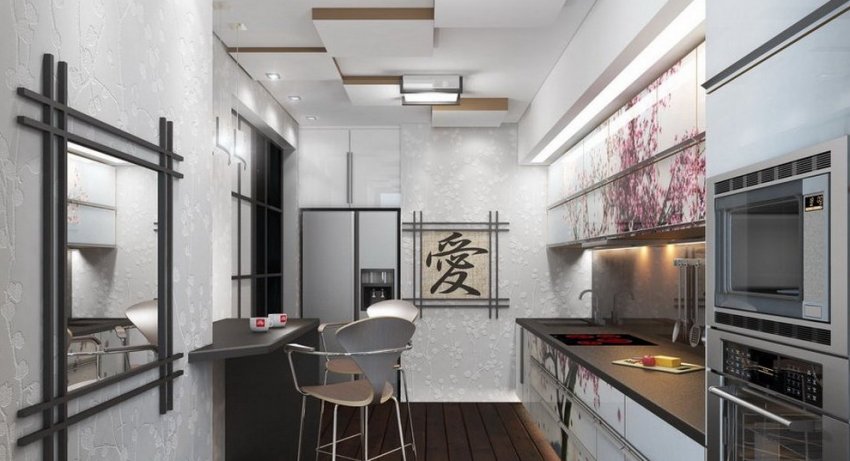 На современной японской кухне можно увидеть и барную стойку как элемент декора, очень гармонично вписывающийся в общую концепцию
