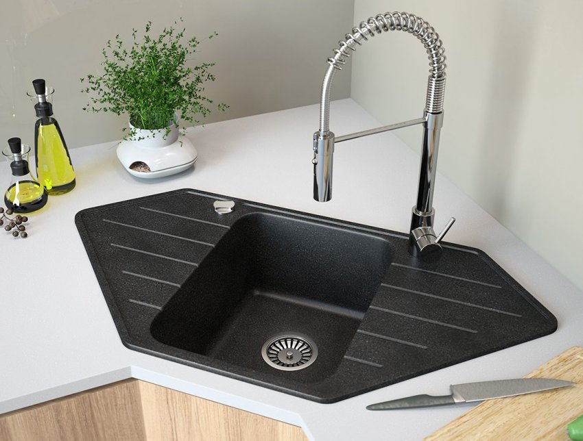В углу кухонного гарнитура можно установить и обычную прямоугольную раковину