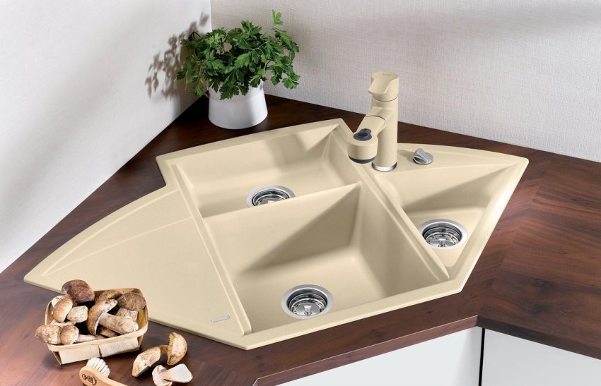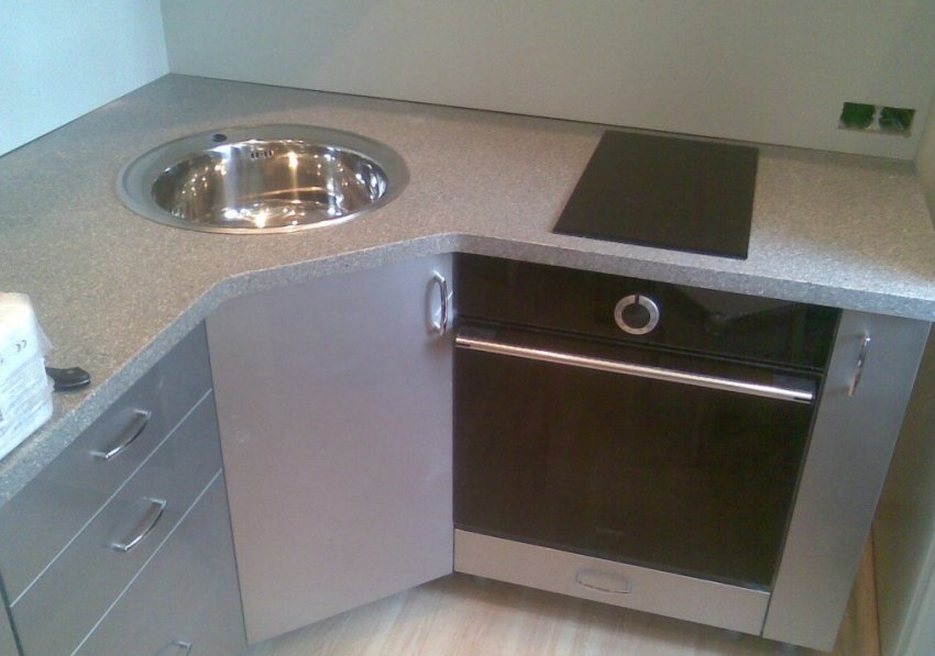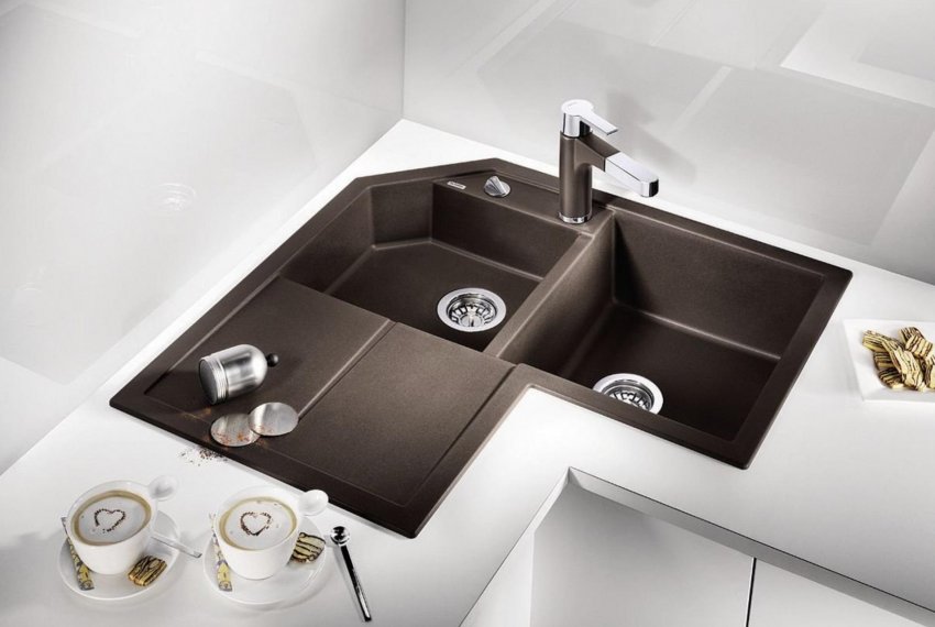 В угол кухонного гарнитура можно установить различные формы моек: