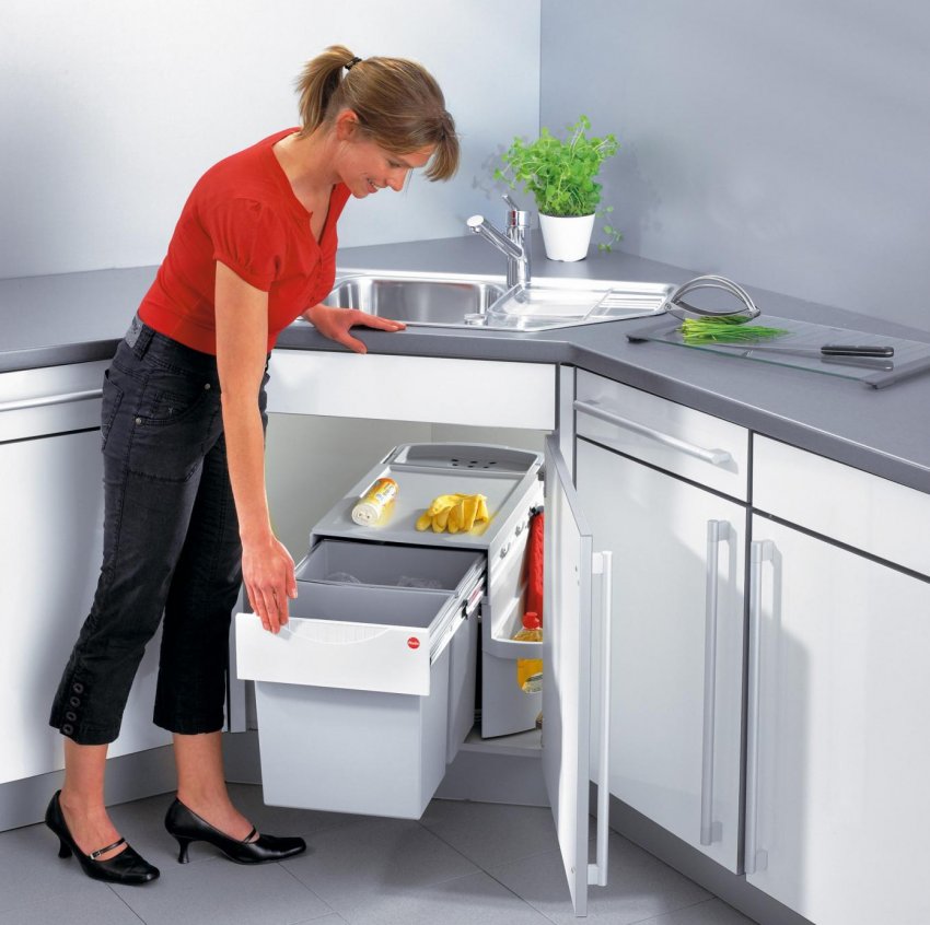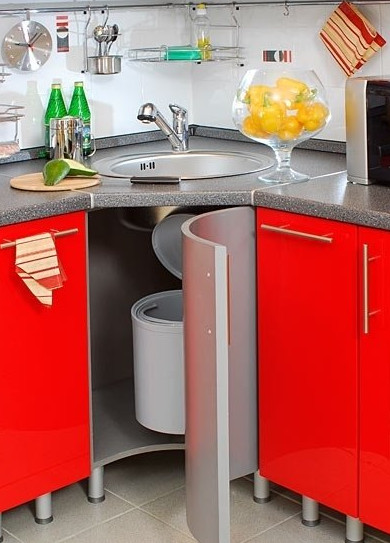 В большой угловой тумбе можно разместить много полезных приспособлений, в том числе систему сбора кухонных отходов