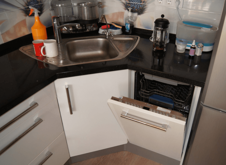 Если в гарнитуре предусмотрена посудомойка, то выбирать большую угловую мойку не обязательно