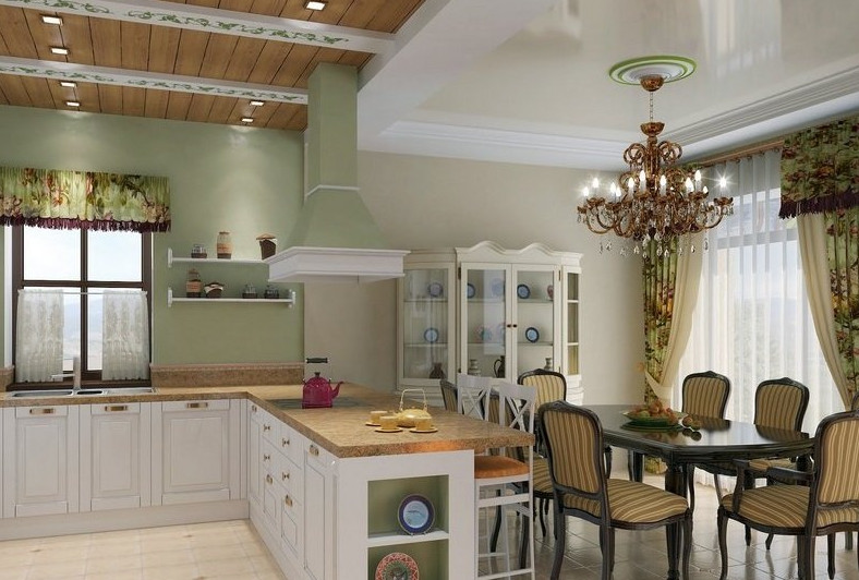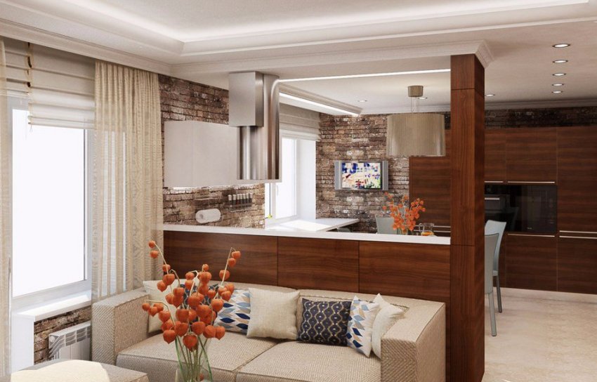 Применение разных оттенков позволит визуально разделить зоны помещения. Например, если кухню оформить в темных тонах, а в гостиной использовать светлые цвета. Эффективно и применение контрастного напольного покрытия, создание подиума в зоне кухни, потолок разных цветов и другие подобные решения.
