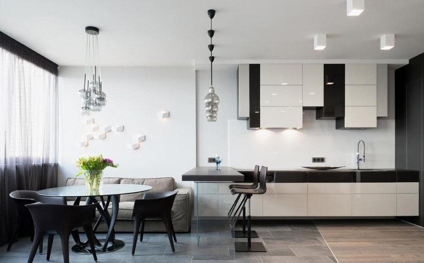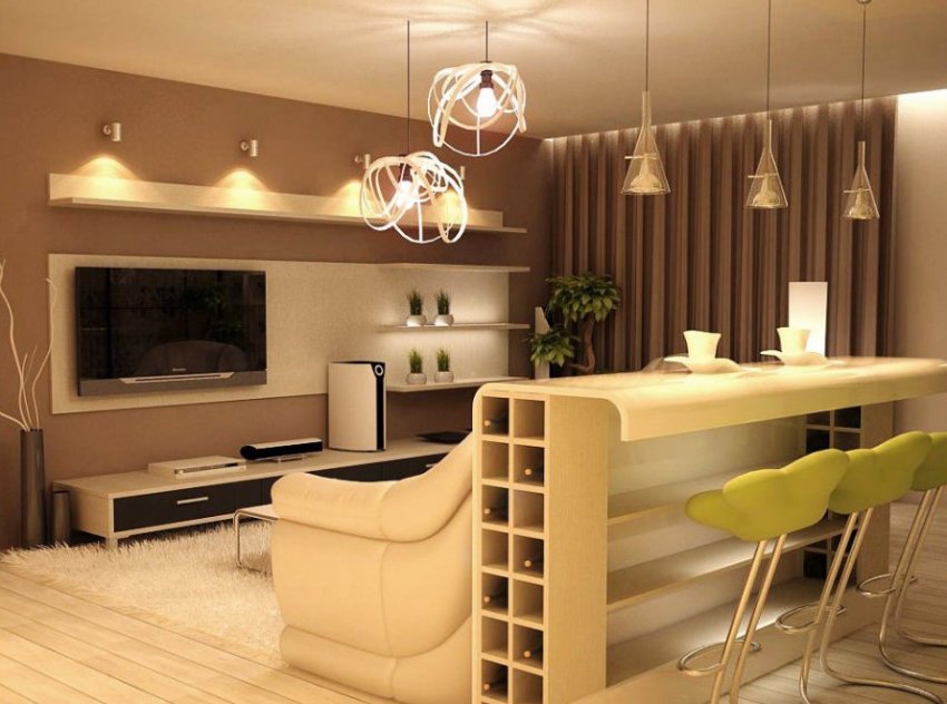- освещение в зоне кухни и области гостиной может быть представлено разными источниками света, что обеспечит визуальное зонирование. Над обеденным столом часто располагается люстра, рабочая зона подсвечивается точечными приборами, а в гостиной легко расположить встроенные светильники по периметру потолка для равномерной освещённости. В качестве дополнительных источников используют торшеры, настольные или настенные лампы;Барную стойку можно подсветить отдельно с помощью люстр