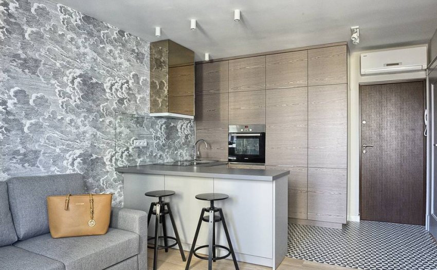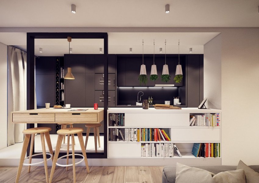 - барная стойка позволяет разделить квартиру-студию на кухню и гостиную.