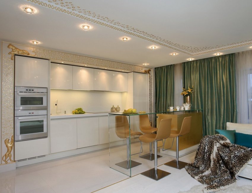 - в современном стиле ар-деко можно использовать барную стойку необычной формы, например, в виде столешницы, плавно переходящей в основание. Пластик, стекло, изящные узоры, 1 – 2 ярких оттенка, хромированные детали уместны в этом дизайне. Барная стойка должна соответствовать по тону, стилю, оформлению другой мебели на кухне и гостиной;В стиле ар-деко уместны роскошные детали и эффектные принты