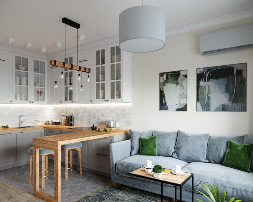 Совмещение кухни с гостиной позволяет сделать большое пространство максимально функциональным и удобным. При этом стоит визуально отделить друг от друга зону гостиной и область кухни. Барная стойка часто используется для этой цели, а соблюдение принципов оформления позволит правильно организовать удобное пространство.