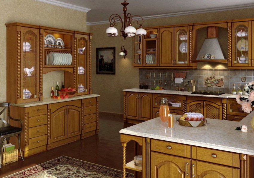 - Кухонный гарнитур. Излишне говорить, что кухонные комплекты должны быть из природных материалов, отличаться изысканным дизайном и функциональностью. Естественно, что готовый гарнитур в маленькой кухне не разместишь, но здесь поможет индивидуальный заказ по нужным размерам либо модульные конструкции. Дополняют гарнитур деревянными табуретами, стульями с резными спинками или скамьями.