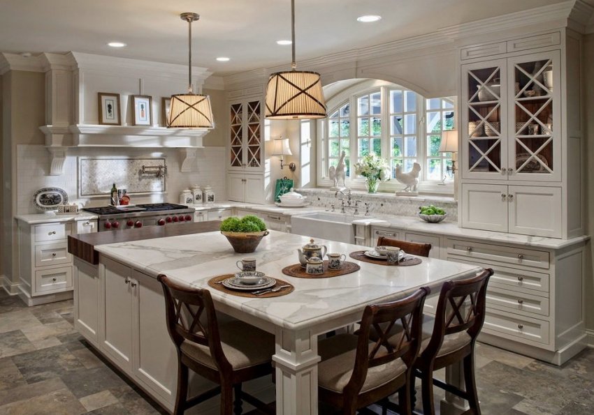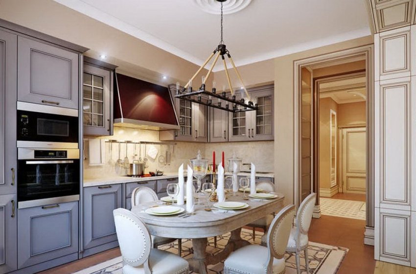- Большая подвесная люстра по центру кухни либо в обеденной зоне — металлическая или хрустальная.