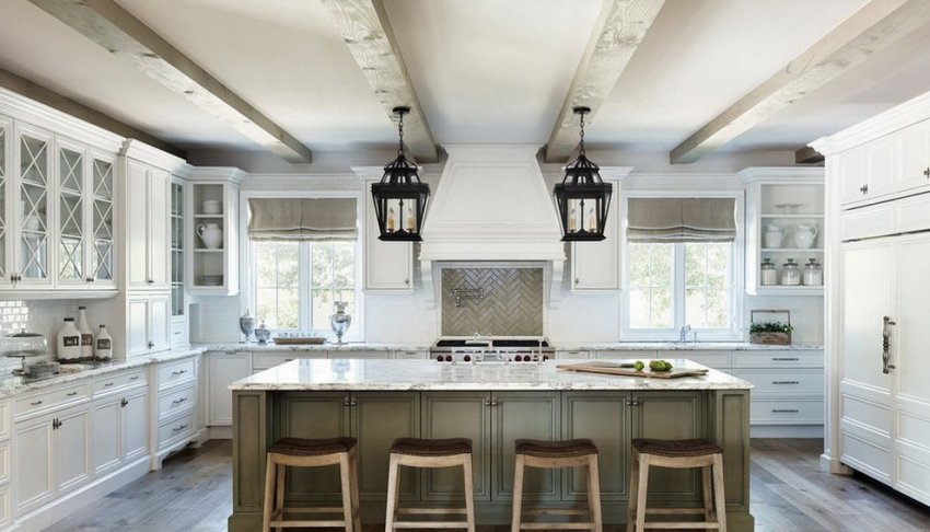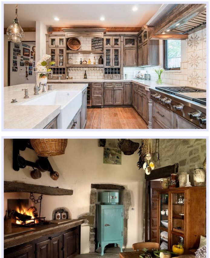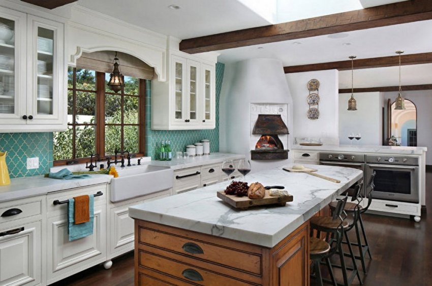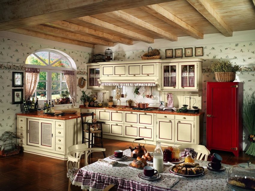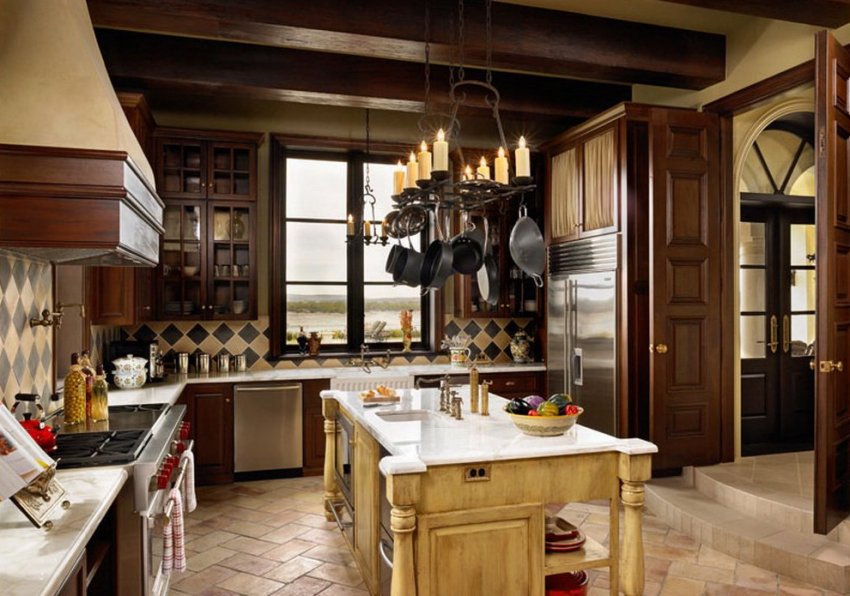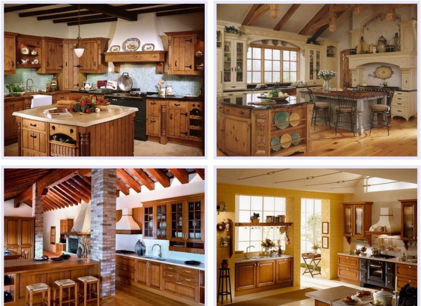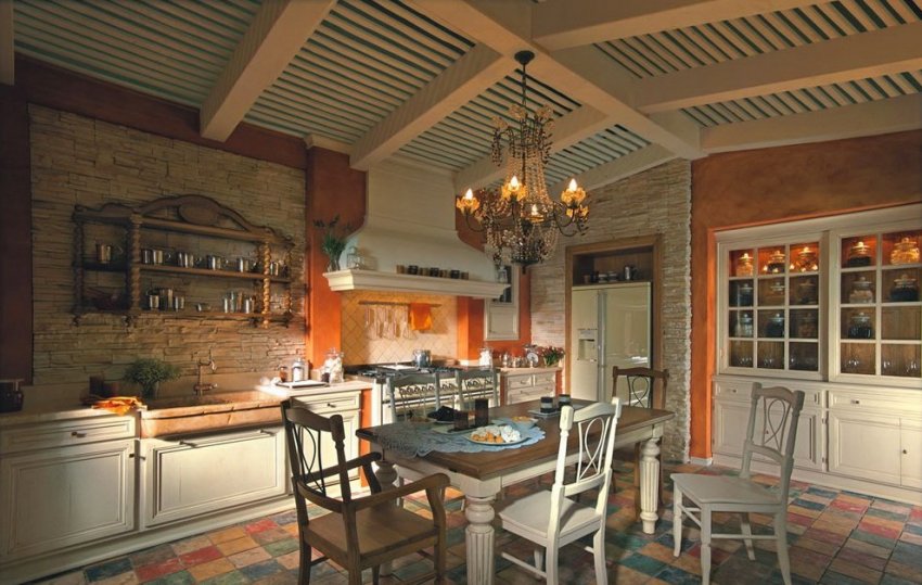 - фактурная штукатурка с массивными балками из ценных пород древесины для частных домов, где они несут практическую нагрузку либо с фальш-балками для городских кухонь;