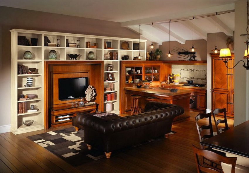 - Предпочтительно тёмная мебель с выраженной древесной текстурой, хотя не запрещены и самые креативные цветовые сочетания.
