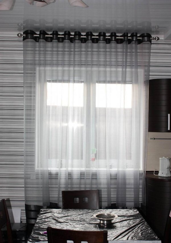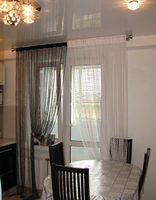 Чёрно-белые шторы-нити подойдут для оформления окна чёрной кухни